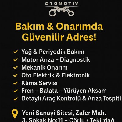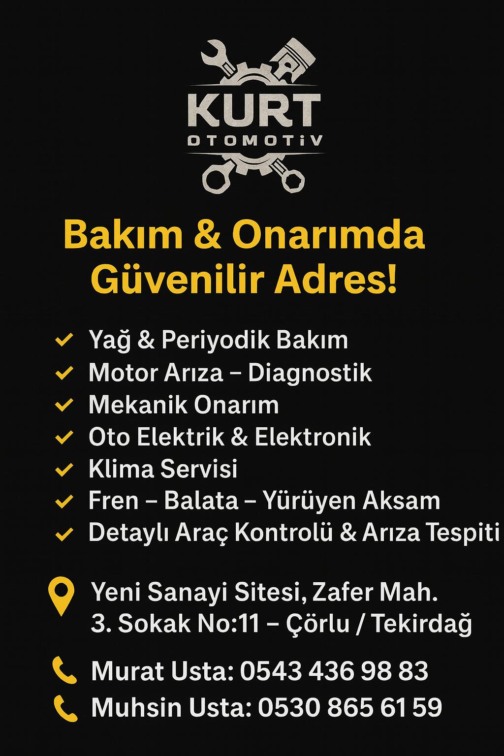 Kurt Otomotiv, otomobil sahiplerine profesyonel, hızlı ve güvenilir oto tamir–bakım hizmetleri sunan köklü bir servistir. Uzman teknisyen kadrosu, modern ekipmanları ve müşteri memnuniyetini ön planda tutan yaklaşımıyla, aracınız için en doğru çözümleri üretir.